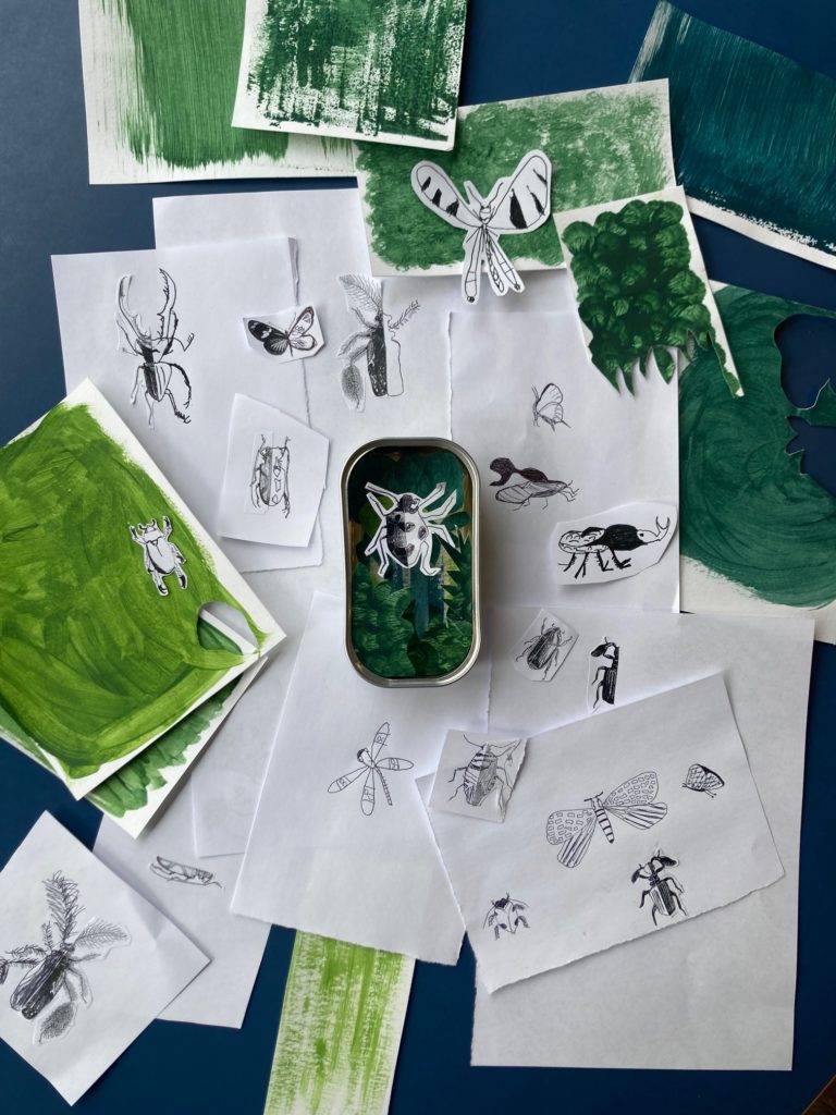 Dans sa grande boîte à outils: gravure sur tetrapak, cyanotype, gravure sur gomme, fabrication de tampons, reliure, collage et outils graphiques en tous genre… Ses domaines d’intervention: